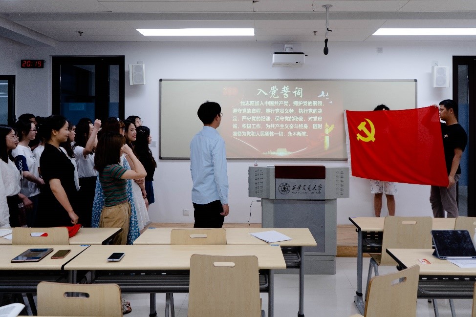 2021年6月18日,中共中央总书记,国家主席,中央军委主席习近平同志参观“‘不忘初心、牢记使命’中国共产党历史展览”时带领党员领导同志重温入党誓词。作为西安交通大学新时代的学子,深入贯彻落实总书记讲话精神。在中国共产党百年华诞之际,参加学习的支部全体党员同志重温入党誓词,面对党旗庄严的宣誓,回忆自己的入党初心。