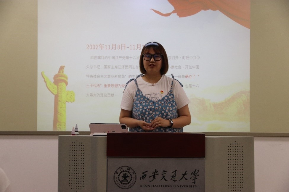任娟同学以《我和我的祖国》电影片段《回归》为抓手,带领大家重回24年前的1997年7月1日,感受香港回顾祖国的振奋人心时刻;李楠同学从形成背景、提出过程、科学内涵以及历史地位四个方面出发为大家系统的阐释了2002年7月1日提出的“三个代表”重要思想;
