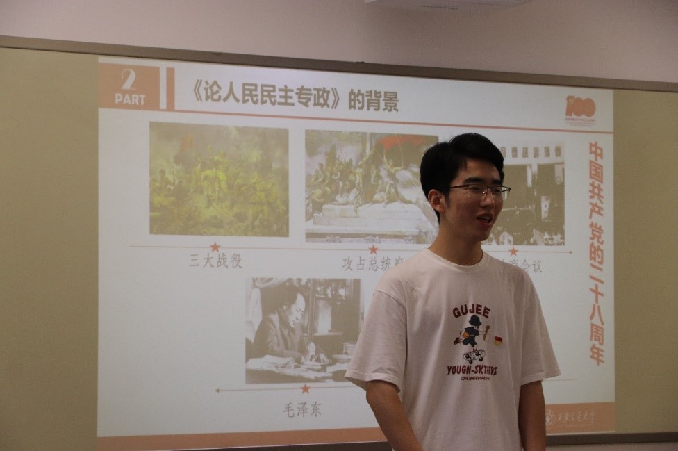 张儒亭同学依据《论持久战》中的原文,为大家解答为什么会把党的生日定在7月1日。王鸿博同学从背景、内容及意义三方面出发为大家讲述1949年7月1日毛主席在《人民日报》上发表的《论人民民主专政》;