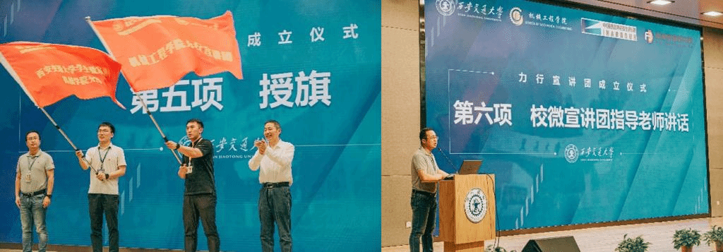 王朝晖、薛周利、苏翔、陈晨共同为力行宣讲团揭牌。陈晨、王朝晖向力行宣讲团负责人杨江坤、机械学院团工委书记苏宇授旗。