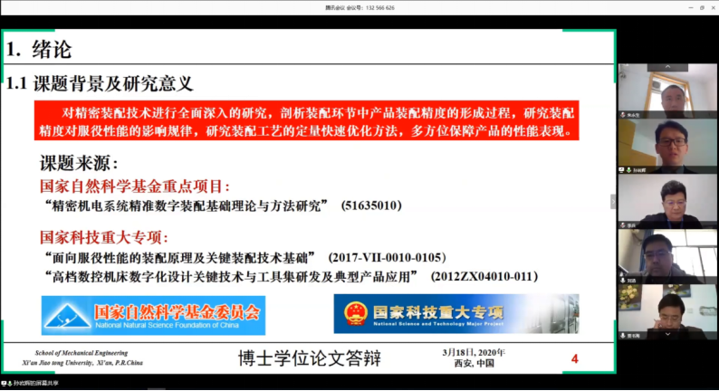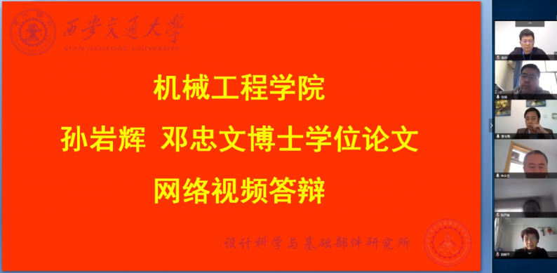 网络视频答辩严格按照学校学位论文答辩的规范要求进行。西北工业大学张开富教授,西安理工大学刘涵教授,西安交通大学李兵教授、洪军教授、贾书海教授、刘志刚教授、朱永生教授、张进华教授,设计所相关研究生参加了此次答辩会。校督导组专家赵桂平教授对此次答辩会进行了全程督导。李兵教授任答辩委员会主席,苏文军讲师、郭俊康助理研究员任答辩委员会秘书。
