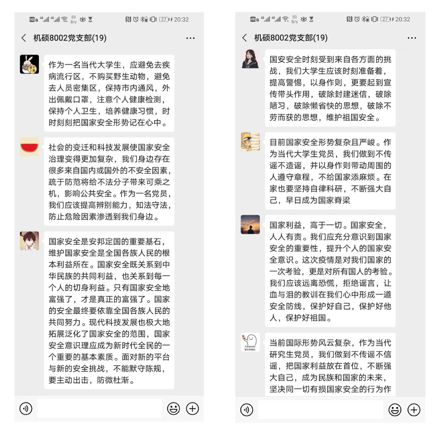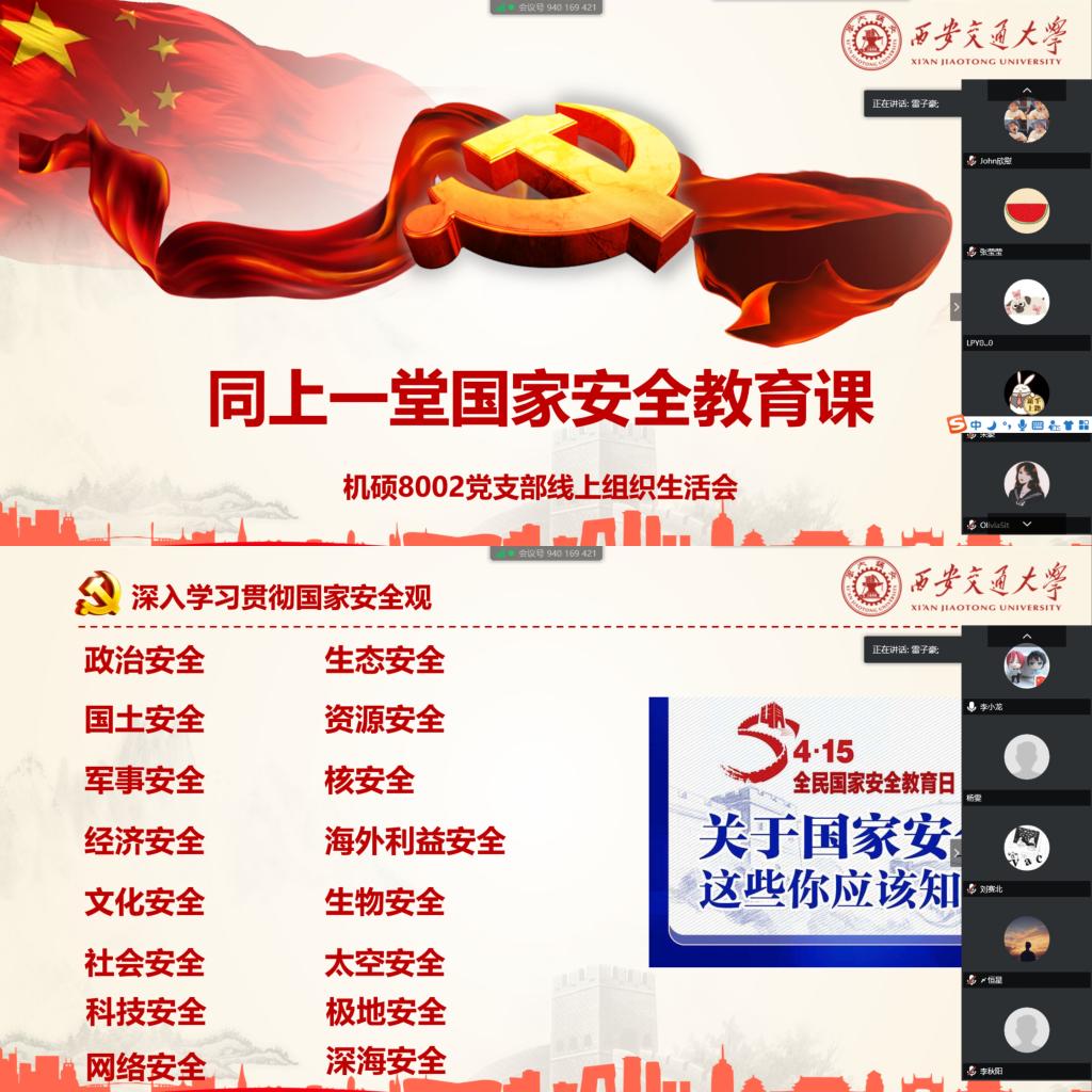 2020年4月15日下午14:00,西安交通大学米兰网页版硕8002班党支部通过腾讯会议及微信群开展了主题为“同上一堂国家安全教育课”的线上党组织生活会,会议由党支部书记雷子豪主持。