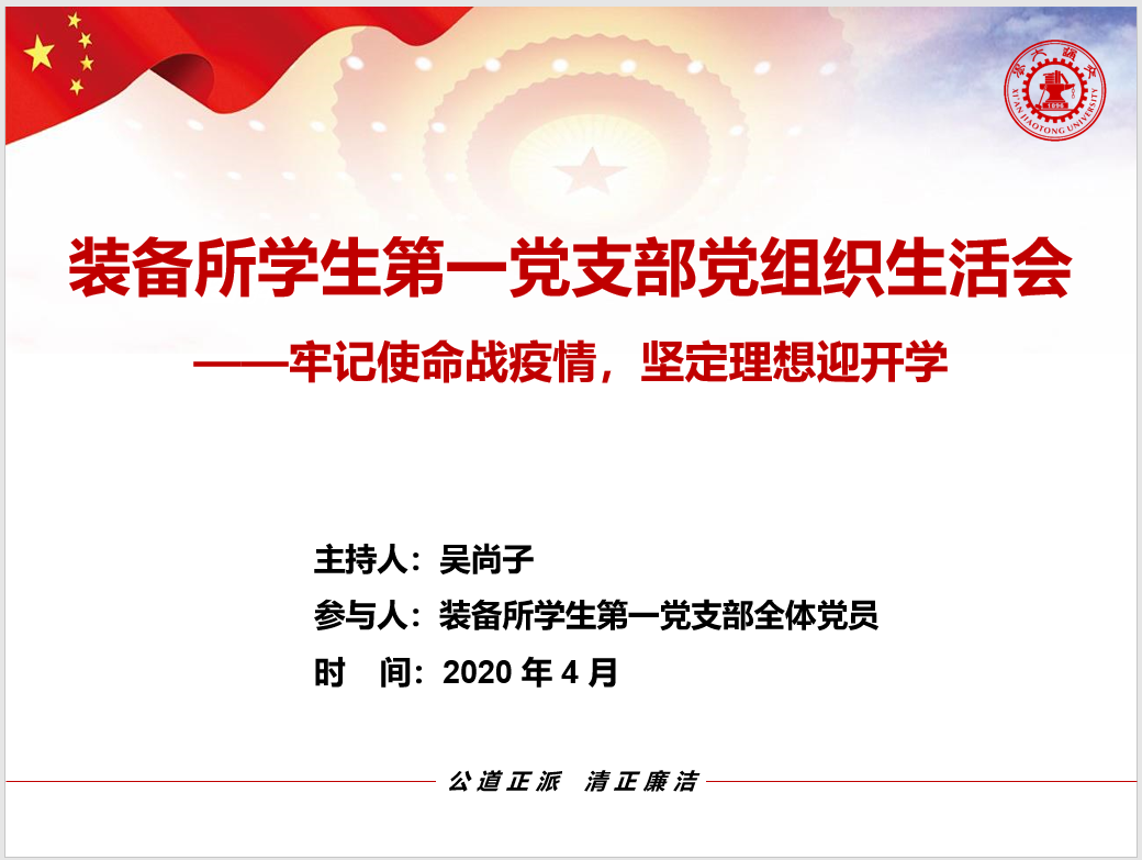 牢记初心使命,坚定理想信念。2020年4月21日,米兰网页版装备所博士生第一党支部开展了主题为“牢记使命战疫情,坚定理想迎开学”的线上党组织生活会,会议由党支部书记吴尚子主持。