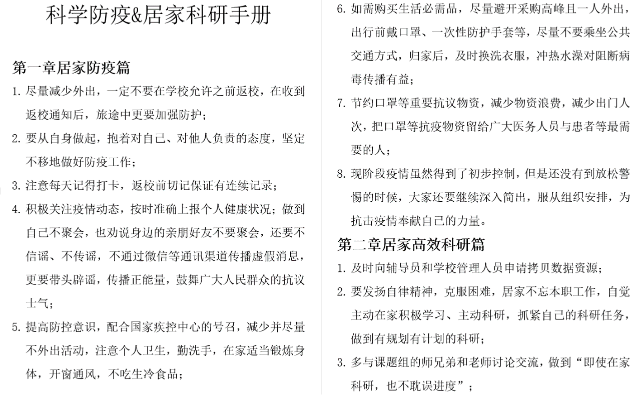 科学防疫,科技助研,冬天终将过去;充分准备,迎接开学,春天还会花开。防控疫情期间,同学们采取居家学习科研的方式,随着4月19日陕西省教育厅发布关于做好陕西高校2020年春季学期开学工作的通知,开学也终于被提上议程。关于返校前如何在家高效科研,以及如何安全返校并在返校后科学防疫,大家献计献策,分享防疫知识,并从返校前防疫、居家科研和返校后防疫整理成《科学防疫&居家科研手册》,期望通过党组织生活会,对同学们给予一定的帮助。