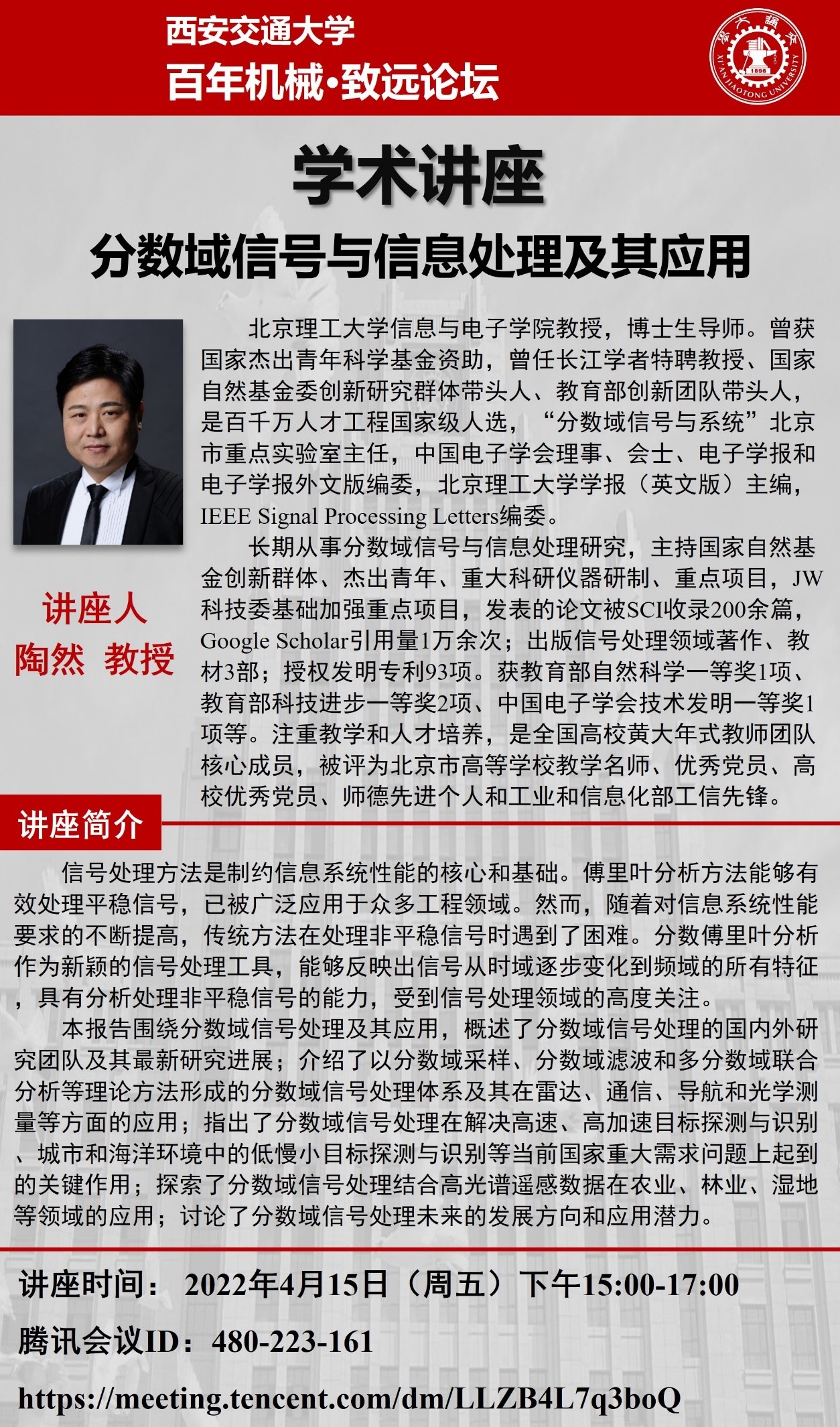陶然,北京理工大学信息与电子学院教授,信息与通信工程、应用数学双学科博士生导师。曾获国家杰出青年科学基金资助,曾任长江学者特聘教授、国家自然基金委创新研究群体带头人、教育部创新团队带头人,是百千万人才工程国家级人选,“分数域信号与系统”北京市重点实验室主任,中国电子学会理事、会士、电子学报和电子学报外文版编委,北京理工大学学报(英文版)主编,IEEE Signal Processing Letters编委。