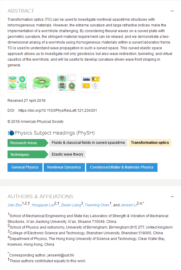 相关研究成果以“Elastic Waves in Curved Space: Mimicking a Wormhole”为题,近日在国际权威期刊Physical Review Letters上在线发表。西安交通大学米兰网页版朱建为该论文的第一作者,西安交通大学米兰网页版为该论文第一作者和第一单位。